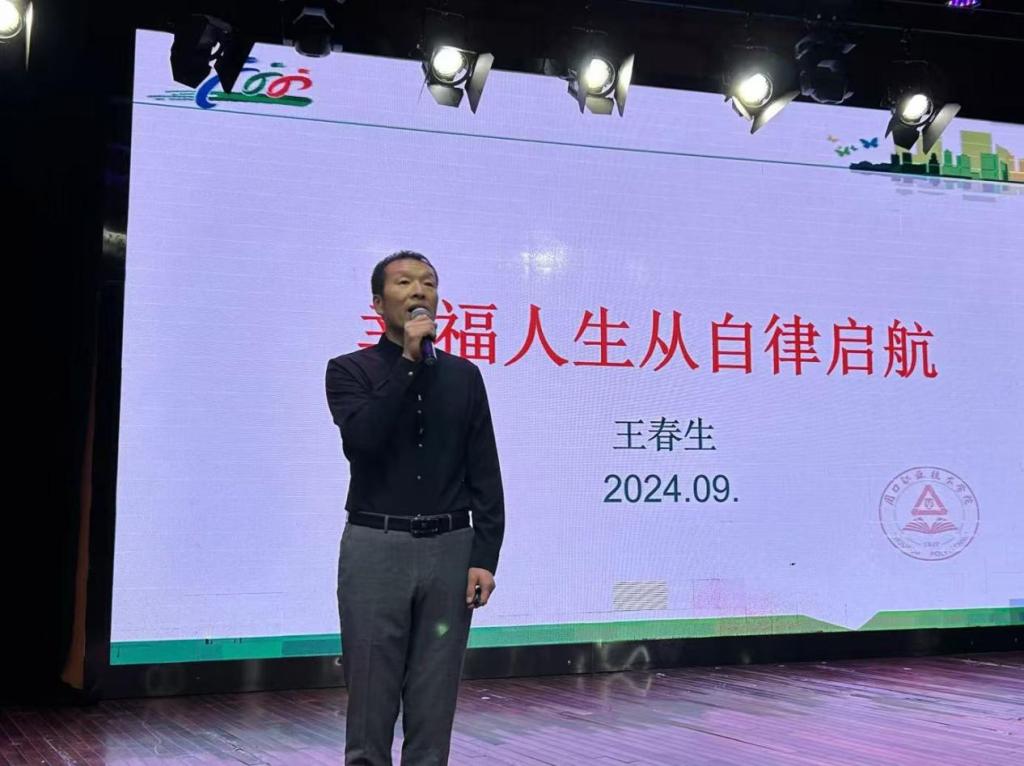王春生带领大家思考“什么是幸福?什么是人生?什么是幸福人生?”,并进行逐层阐述。他指出,幸福并非简单的物质或短暂快乐,而是源于内心深处的满足感,像完成任务后的成就感、亲友相伴的温暖感,是一种积极的心理状态。他用自己的励志人生向我们深刻地展示了自律的力量,告诉大家,成功不是一蹴而就的,它是在无数次与自我惰性斗争的过程中逐渐形成的。自律是一种积极向上、坚韧不拔的生活态度,它能够帮助我们克服困难,实现价值和目标,就像他通过自律成功减掉了多余的体重,收获了健康和自信一样。