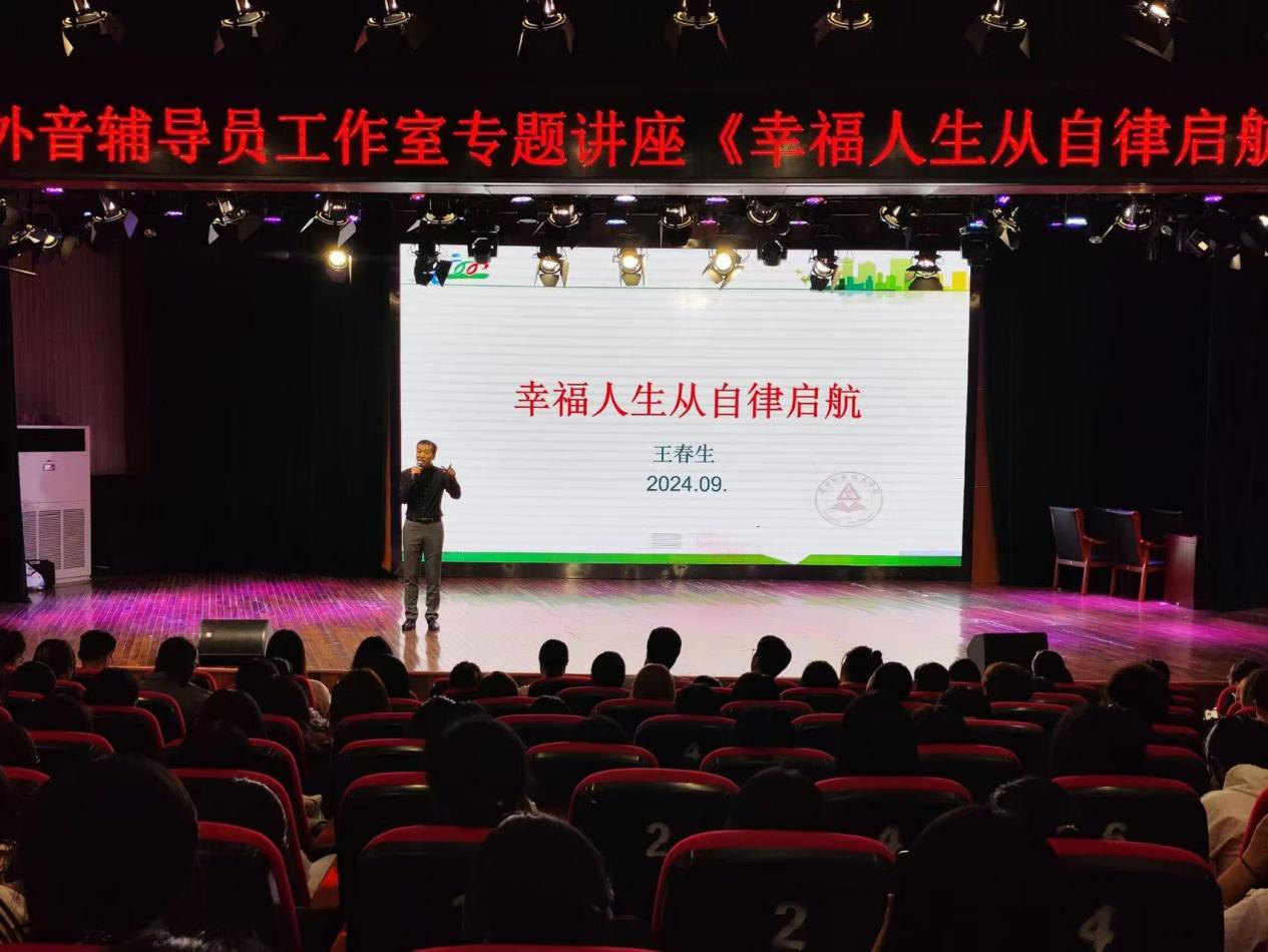 为提高同学们的自律能力,激发热爱生活、崇尚健康的正确价值观,9月28日晚上,学前与艺术教育学院(纺织服装学院)画外音辅导员工作室在砺德厅举行《幸福人生从自律启航》专题讲座。副院长杨晨、学管办主任郑玉凡、2024级全体辅导员及600余名新生参加讲座,学院党总支书记王春生主讲。