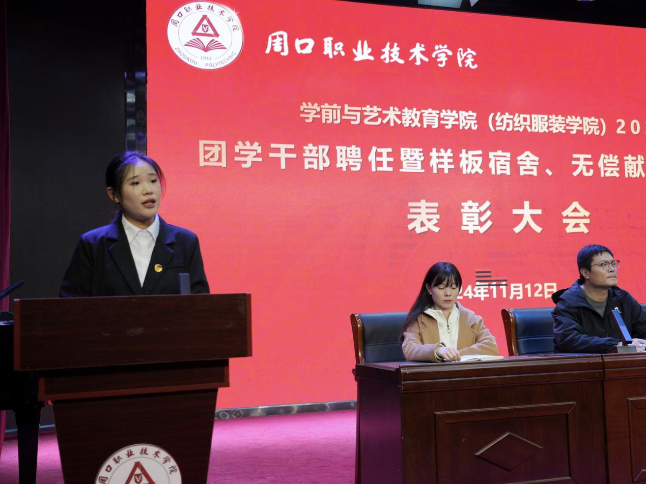 为进一步加强团学干部队伍建设,激发学生干部干事创业的积极性、表彰先进,展现周职学子的青春风采,11月12日晚,学前与艺术教育学院(纺织服装学院)在艺术演播厅召开2024团学干部聘任暨样板宿舍、无偿献血志愿者表彰大会。学院党总支书记王春生,院长高岐奎,学管办主任郑玉凡,教管办主任李晨阳,团总支书记刘馨馨,23级、24级全体辅导员老师及学生代表参加本次大会。大会由学院副院长杨晨主持。