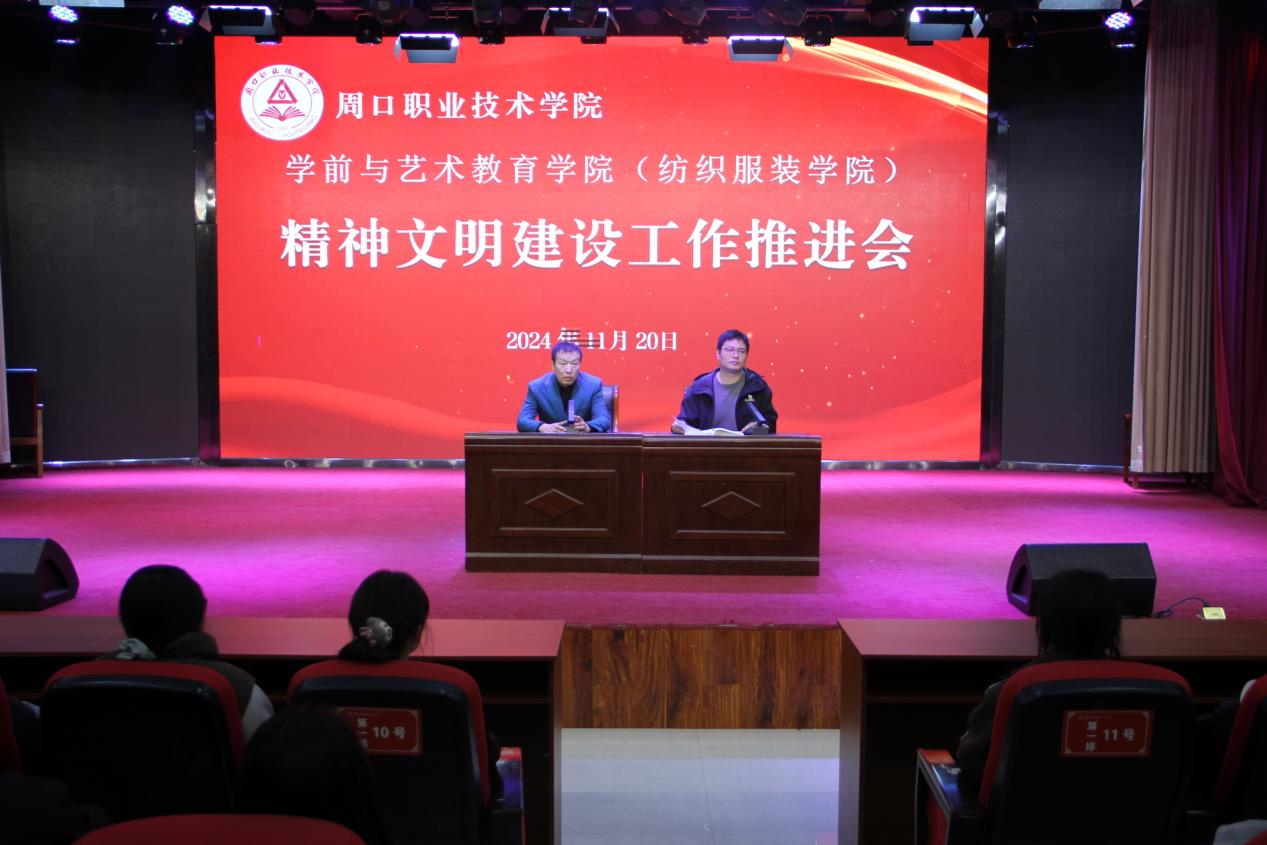 为认真贯彻落实学校精神文明工作会议精神,稳步推进我院精神文明建设再上新台阶,11月20日,学前与艺术教育学院(纺织服装学院)在艺术演播厅召开精神文明建设工作推进会,学院党总支书记王春生、副院长杨晨以及全体学生干部、各班班长、学生代表参加会议。
