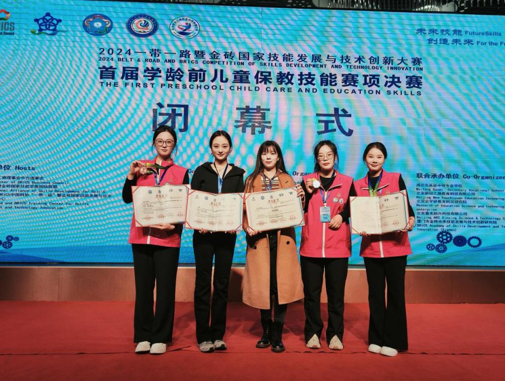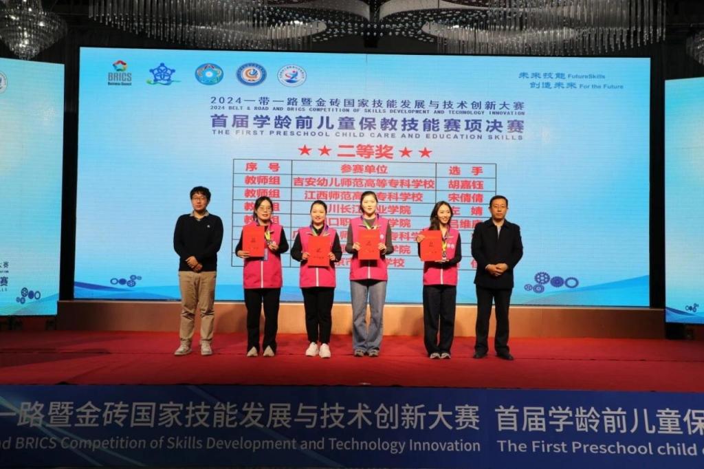 2024年11月24日“一带一路暨金砖国家技能发展与技术创新大赛”首届学龄前儿童保教技能赛项决赛在山东高密落下帷幕。本次大赛由金砖国家工商理事会中方理事会、一带一路暨金砖国家技能发展国际联盟、中国科协“一带一路暨金砖国家技能发展与技术创新培训中心”等多个单位联合主办,吸引了来自全国各地的146支参赛队伍。大赛以学龄前儿童保教人员应具备的知识、技能、素质为核心,设置了“综合职业能力测评”“保教技能知识测评”“保育技能实操”“教育活动设计及模拟教学”“托幼机构保教环境创设”五个模块,全面考核选手的综合知识水平和各项学龄前儿童保教技能应用。