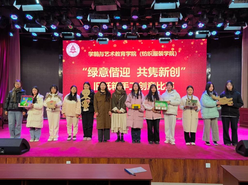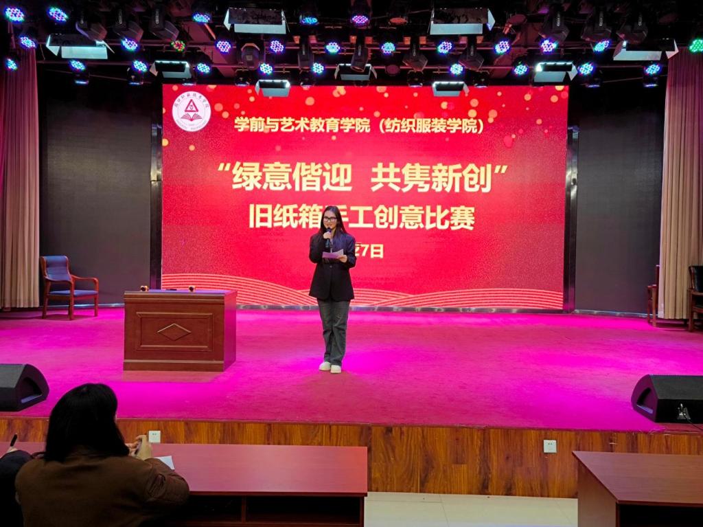 为丰富校园文化生活,提升学生的专业技能和创新能力,提高环保意识和综合素养。11月27日晚,学前与艺术教育学院(纺织服装学院)在艺术演播厅开展“绿意偕迎,共隽新创”旧纸箱手工创意比赛。学院团总支书记刘馨馨、辅导员李晓悦及学生代表担任评委。