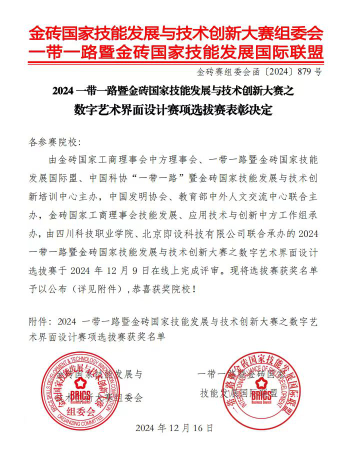 12月16日,2024一带一路暨金砖国家技能发展与技术创新大赛——数字艺术界面设计赛项选拔赛结果正式公布,我院三支参赛团队脱颖而出。