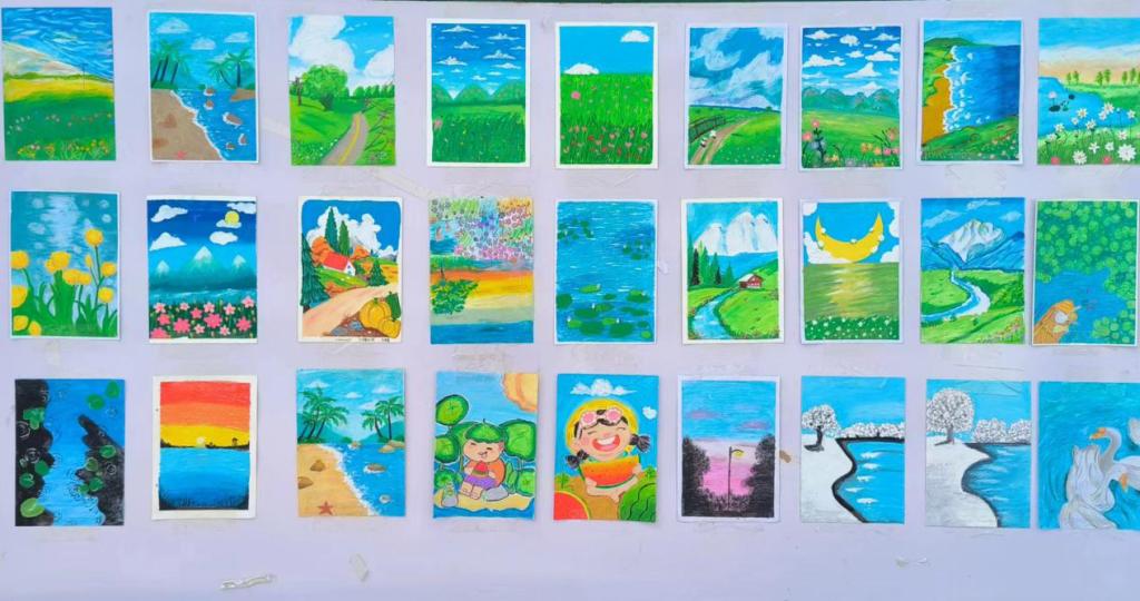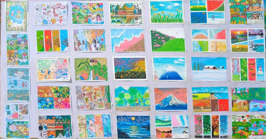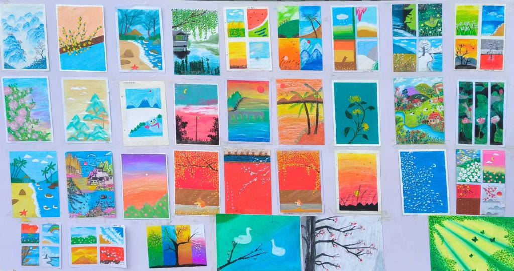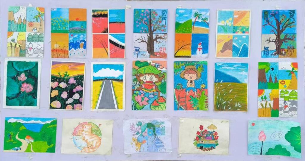 同学们在画纸上尽情挥洒自己对四季的理解和感悟,描绘出一幅幅充满童趣的美丽图画,一幅幅色彩鲜艳、生动活泼、栩栩如生的画面跃然纸上。