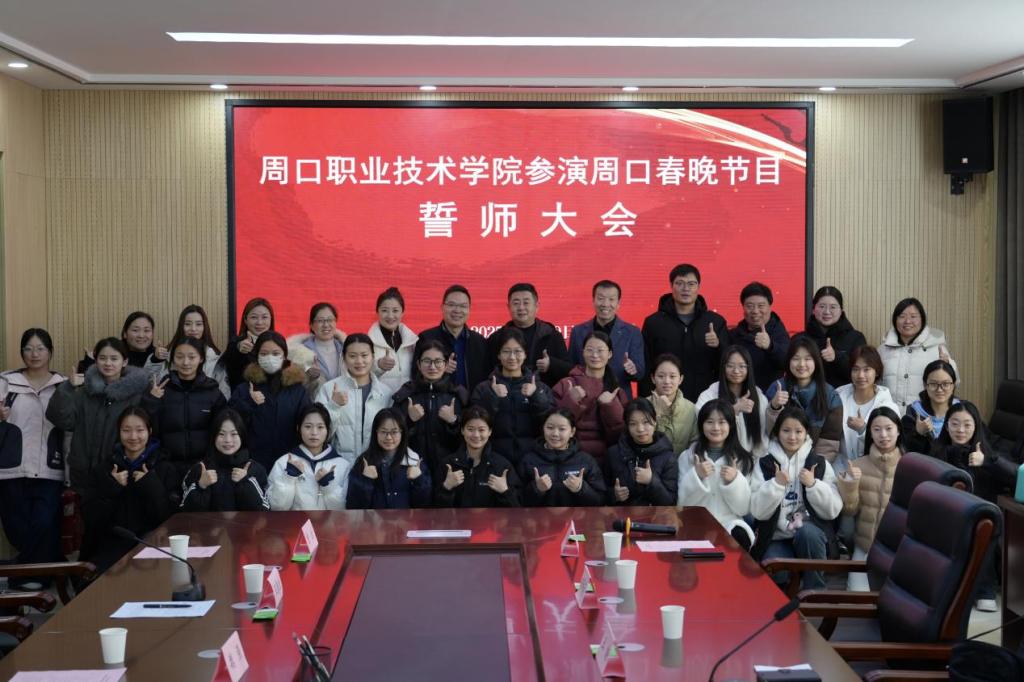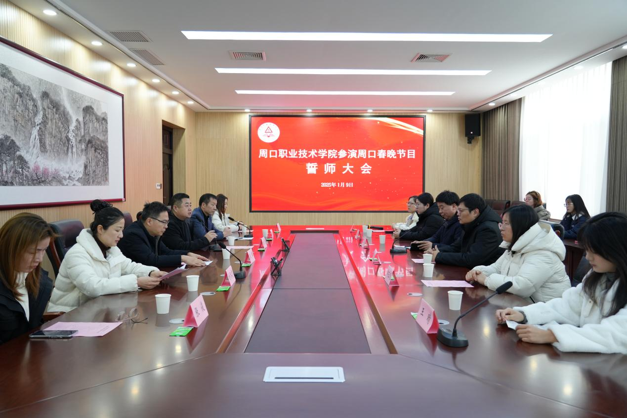 祥龙辞岁福泽绵,金蛇纳祥启新篇。2025年1月9日,周口职业技术学院在校第六会议室举行参演2025年周口春晚节目誓师大会。2025周口春晚总导演魏强、2025周口春晚导演张俊、曾乐、周口职业技术学院副校长王隼、学生处处长刘冬霞出席会议,我院副院长杨晨、学管办主任郑玉凡、节目组组长王瑜、节目编排老师杨文姬、学生管理老师杨萌萌及参演节目全体演员和节目服务志愿者参加会议,会议由我院党总支书记王春生主持。