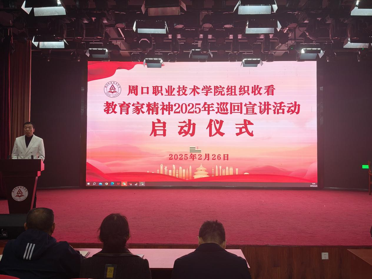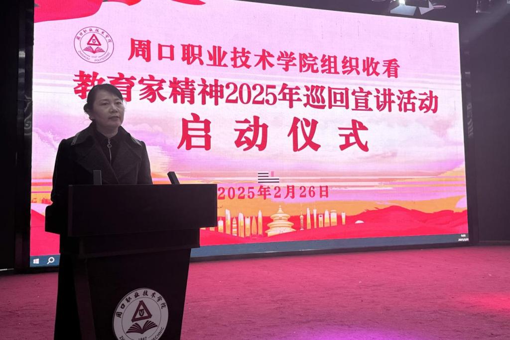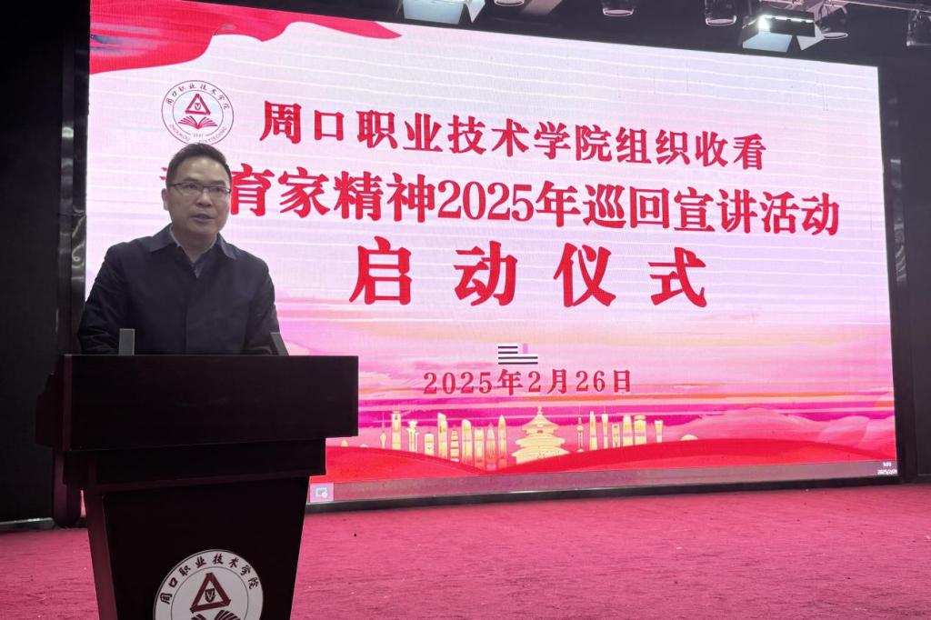 为深入学习贯彻党的二十大精神,大力弘扬教育家精神,2月26日上午,周口职业技术学院在艺术演播厅组织收看教育家精神2025年巡回宣讲活动暨专题学习启动仪式。副校长王隼出席并讲话,人事处、学前与艺术教育学院、文化旅游学院、体育学院负责人及教育类专业师生代表近200人参加。学院党总支书记王春生主持。