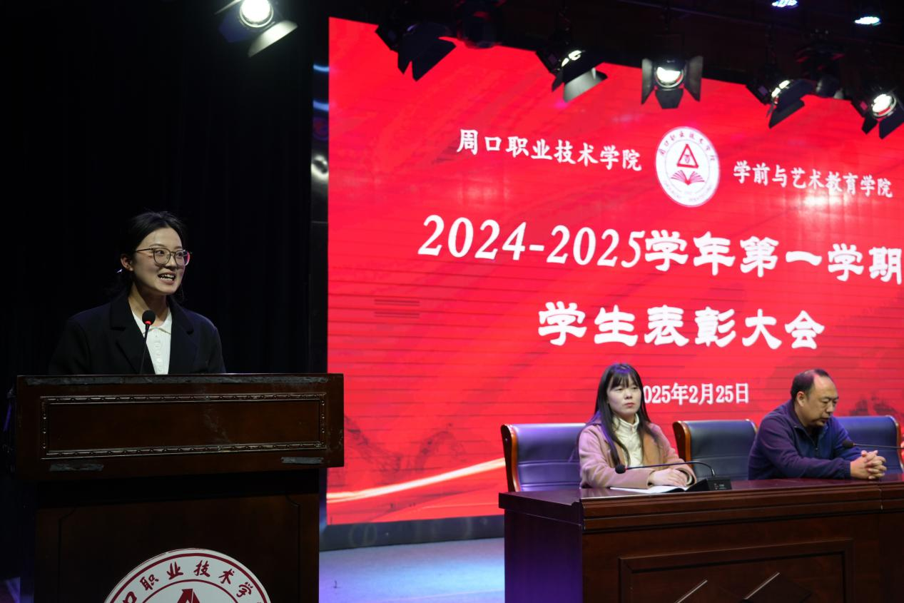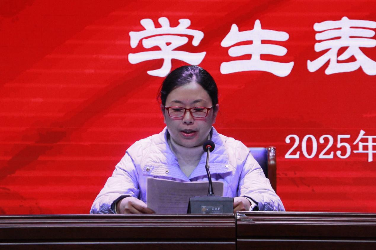 杨晨宣读《学前与艺术教育学院(纺织服装学院)关于表彰2024-2025学年第一学期学院辅导员、三好学生、十佳班长、优秀学生干部、优秀班集体的决定》。学院领导为获奖学生颁发荣誉证书、奖杯。