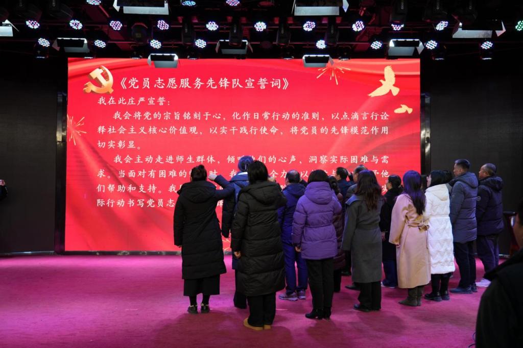 王春生带领全体师生庄严宣誓。在热情洋溢、铿锵有力的宣誓声中,学前与艺术教育学院党员服务先锋队正式成立!