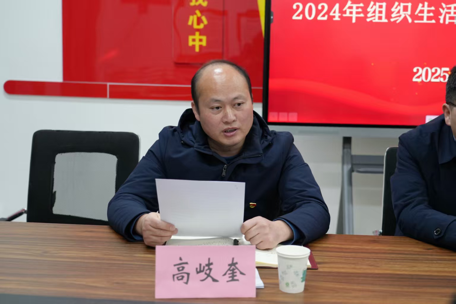 王春生汇报党总支2024年工作完成情况,并代表党总支作对照检查,为下一步的打算做出了要求:强化政治功能,深入推进党风廉政建设,紧扣中心任务,推动各项事业向高质量发展迈进。