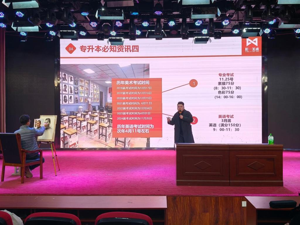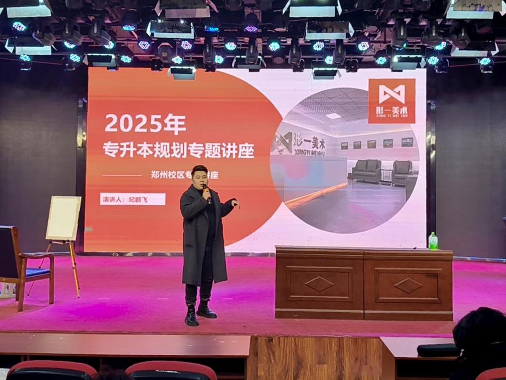 形一美术执行校长纪鹏飞作为主讲人,他以“提高学历层次,成就美好未来”为主题,全面而深入地剖析了河南省专升本政策的整体框架,讲解了报考条件、考试科目、招生计划等关键要素。随后,机构老师通过现场作画的方式,生动展示了应对专升本考试所需的综合能力,为同学们提供了直观的学习范例和启发。