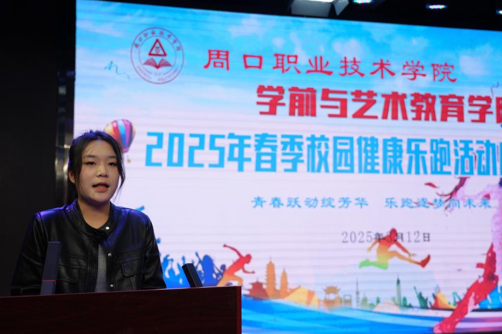 23级学前教育五班秦文妍、24级学前教育三班尤优作为学生代表发言。她们表达了对乐跑活动的热切期待,表明了积极参与的决心,向全体同学发出呼吁:“青春跃动绽芳华,乐跑逐梦向未来!同学们,让我们一起踊跃投身乐跑活动,将运动融入日常,化作生活的一部分,让健康成为生活的底色,用坚持诠释青春的活力,用奔跑追逐美好的未来!”