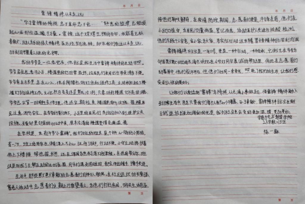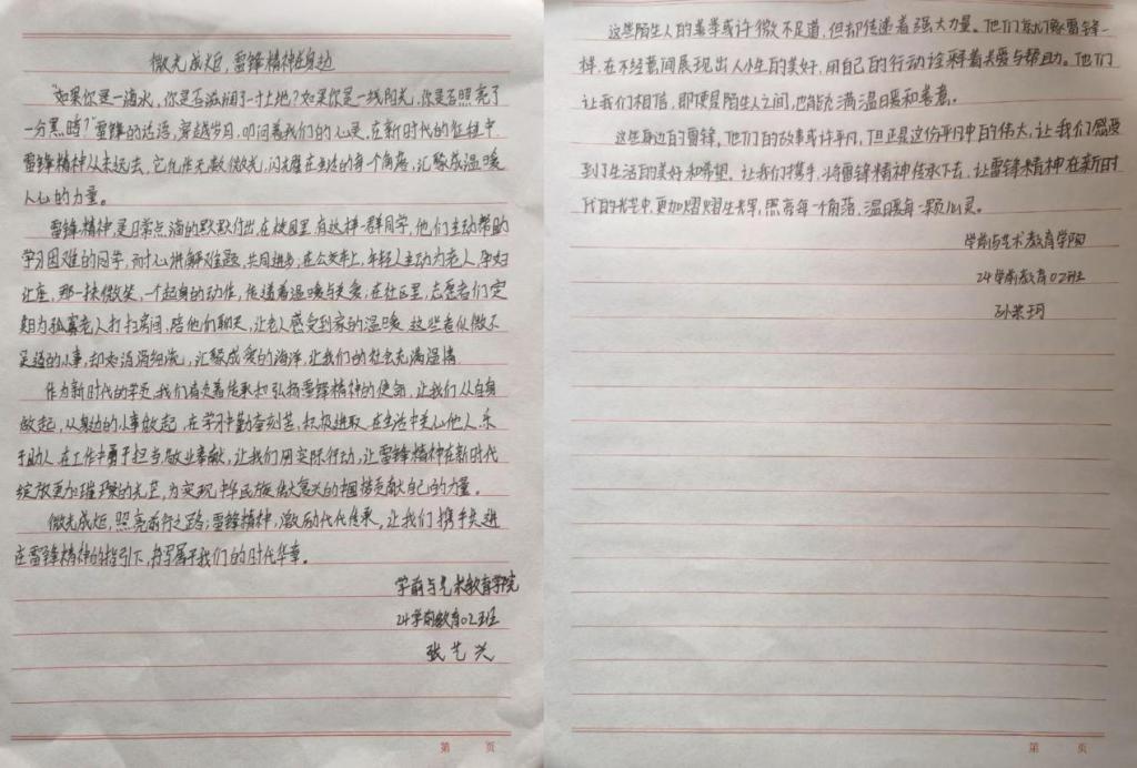 为赓续雷锋精神血脉,涵育新时代青年品格,3月5日,学前与艺术教育学院(纺织服装学院)开展弘扬雷锋精神系列活动之主题征文比赛。学院全体在校生参加活动。