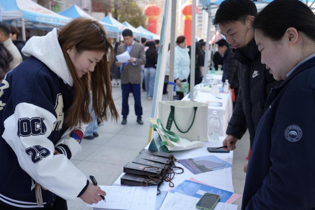 双选会现场气氛热烈,用人单位设立展板,展示各类招聘信息,招聘人员热情细致的讲解岗位要求与职业发展路径,同学们仔细聆听介绍,积极与招聘人员进行交流,认真思考未来职业规划。