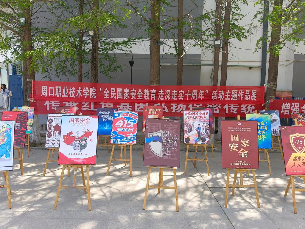 为深入贯彻总体国家安全观,增强学生国家安全意识,营造学院安全文化氛围,4月15日,由周口职业学院主办学前与艺术教育学院(纺织服装学院)承办的“全民国家安全教育,走深走实十周年”活动主题作品展在砺德厅楼下举办。