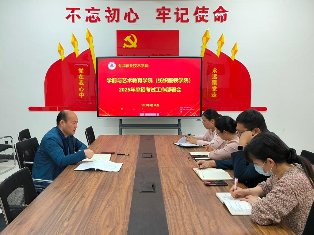 为切实做好我院2025年单招考试工作,确保单招考试安全、平稳、有序进行,4月16日上午,学前与艺术教育学院(纺织服装学院)在四楼党员活动室召开2025年单招考试工作部署会。学院副院长耿润、杨晨,学管办主任郑玉凡,教管办主任李晨阳参加会议。会议由院长高岐奎主持。