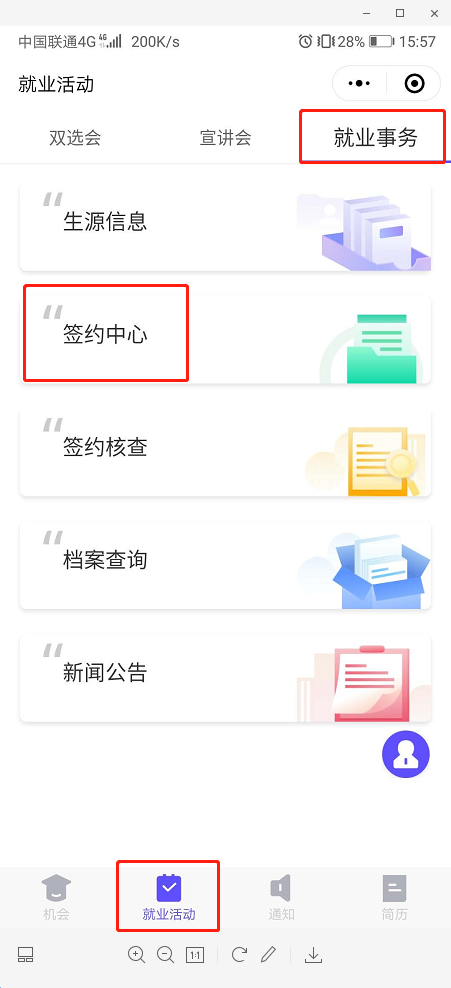 登录之后选择底部“就业活动”中的“就业事务”,点击“签约中心”;