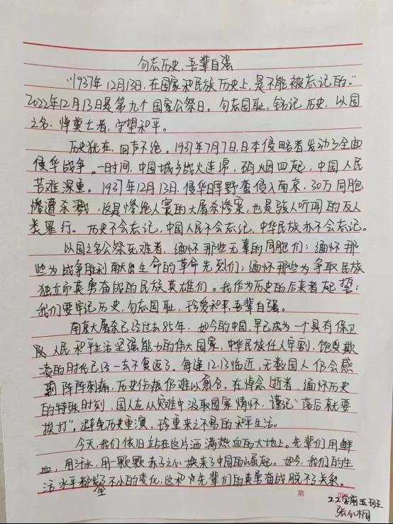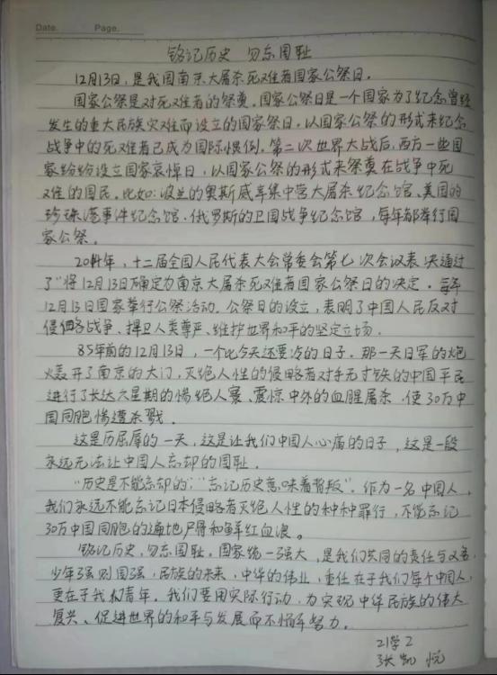 铭记苦难,永志不忘。同学们积极参与主题征文活动,牢记侵略战争给中国人民造成的深重灾难,加深同学们对南京大屠杀历史的了解。
