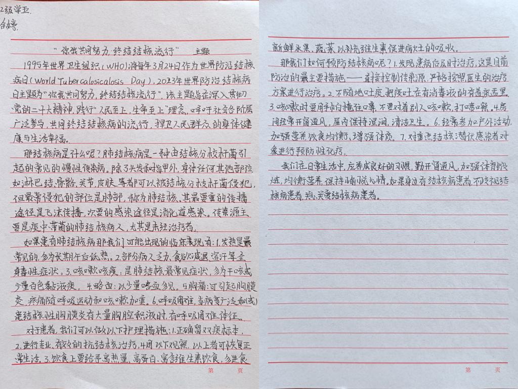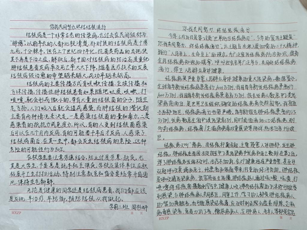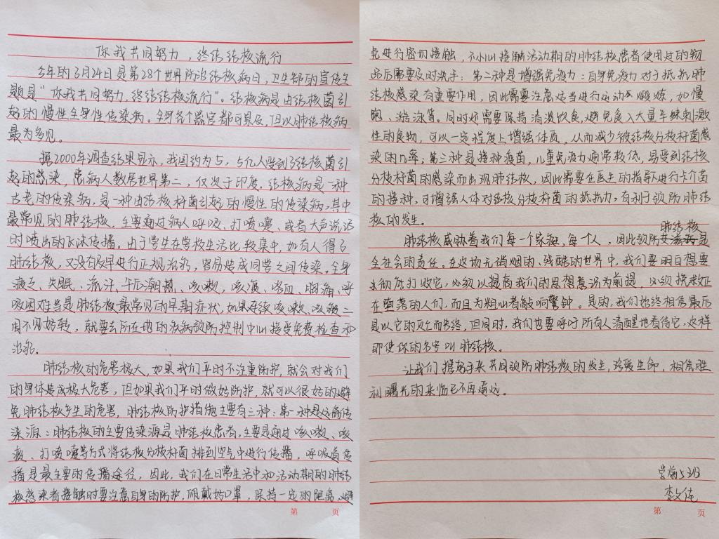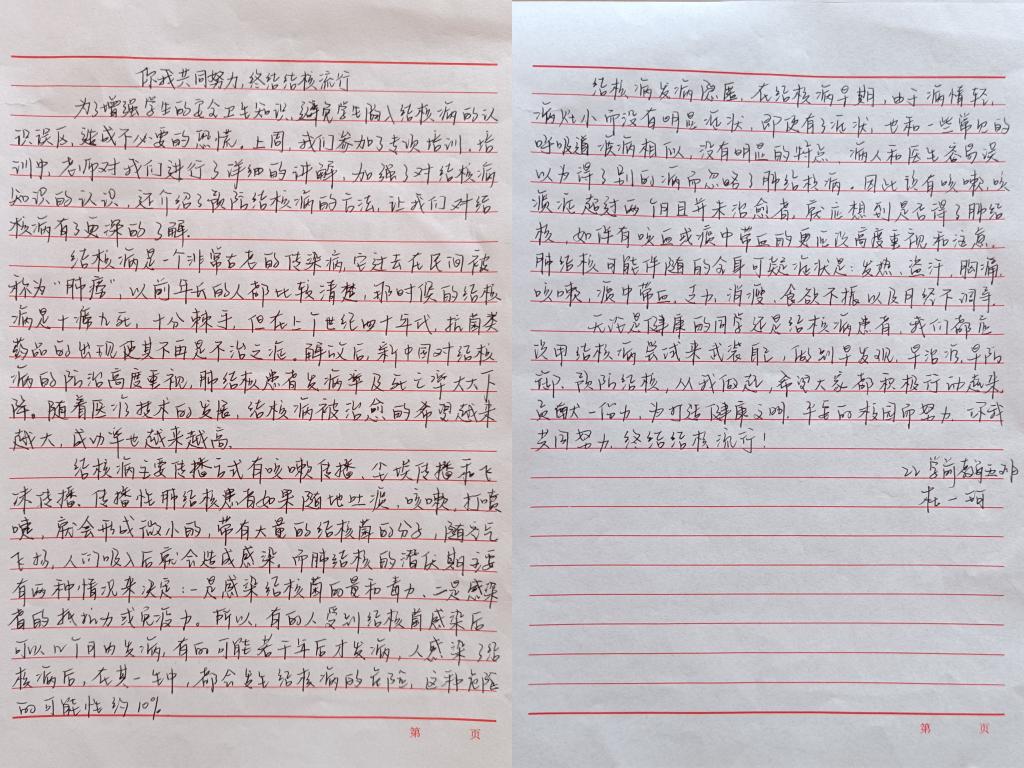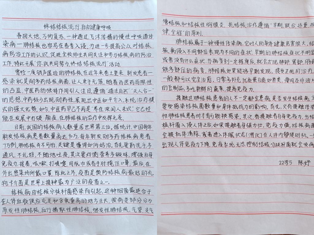 同学们结合文学写作能力和所学的结核病防治知识,形成一个融合肺结核防治核心信息和学生信念为一体的文章,帮助学生更透彻地理解肺结核的流行、症状、危害,以及治疗和预防措施。