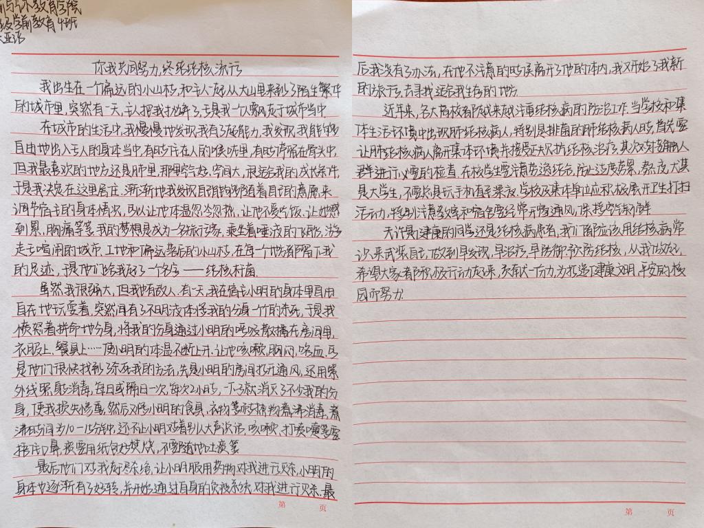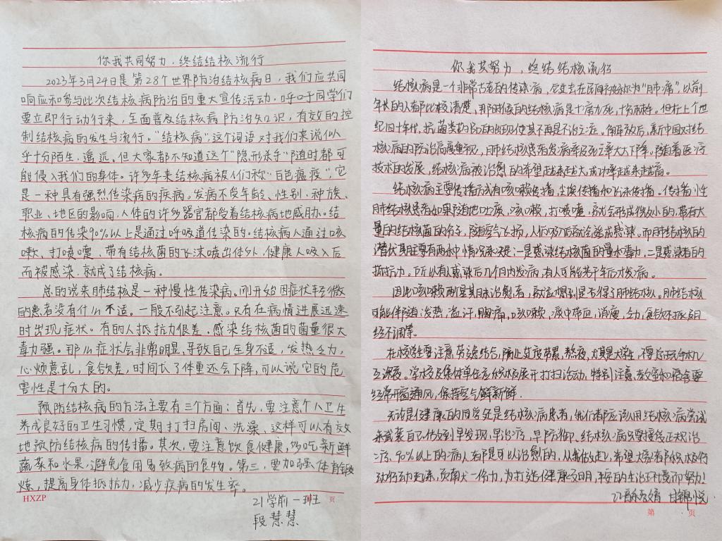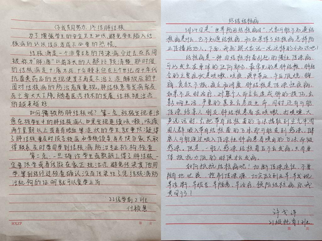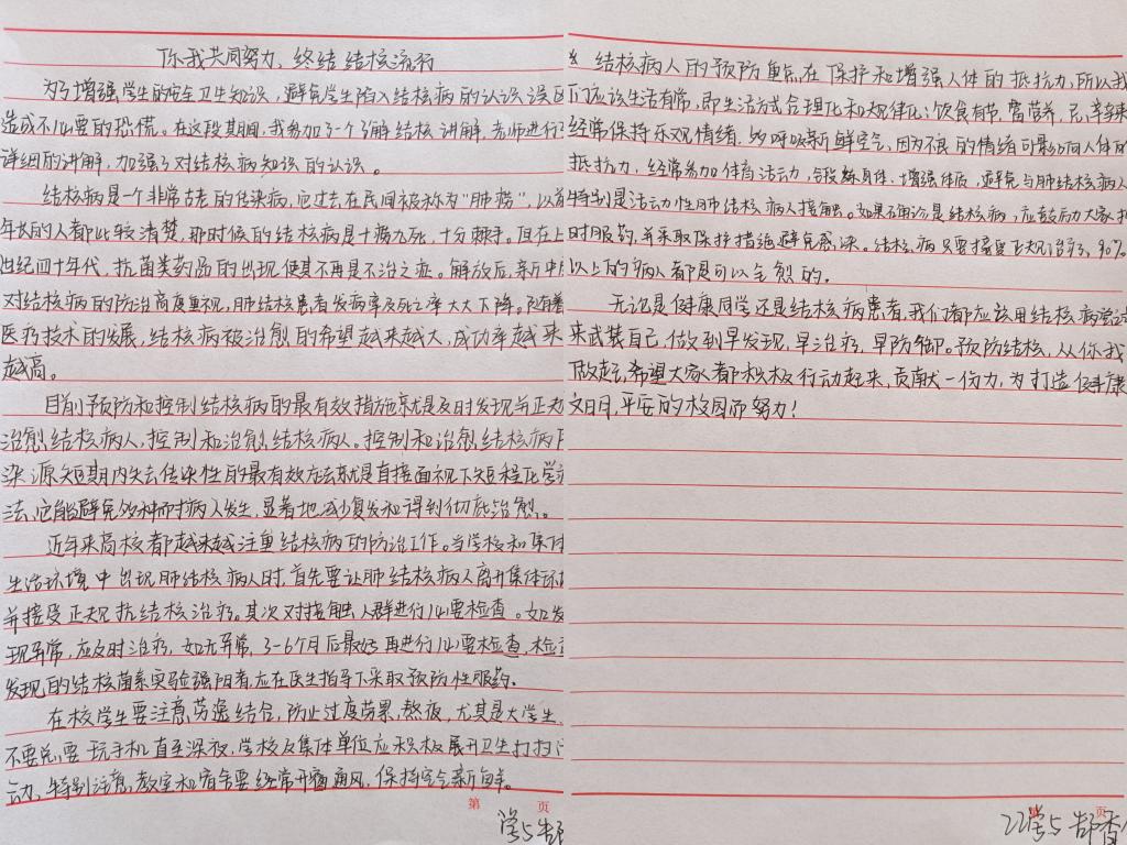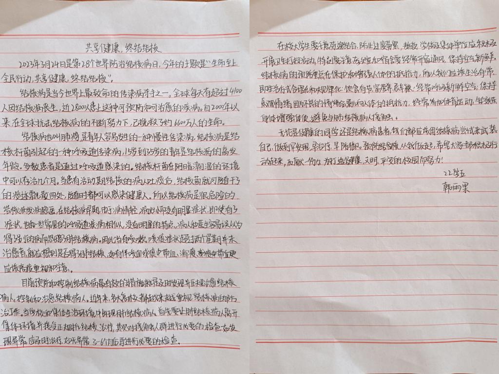 同学们结合文学写作能力和所学的结核病防治知识,形成一个融合肺结核防治核心信息和学生信念为一体的文章,帮助学生更透彻地理解肺结核的流行、症状、危害,以及治疗和预防措施。