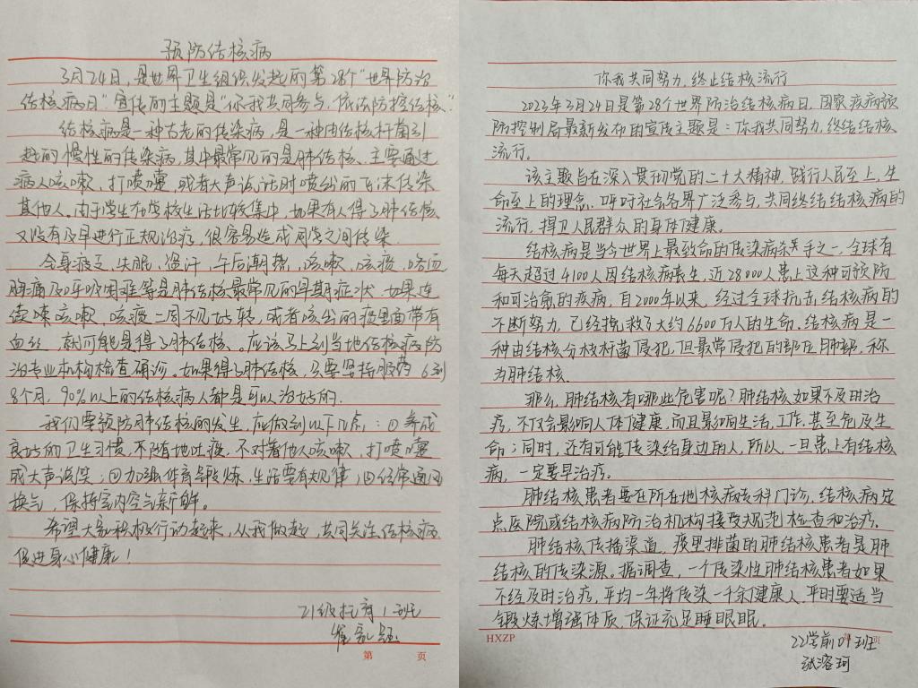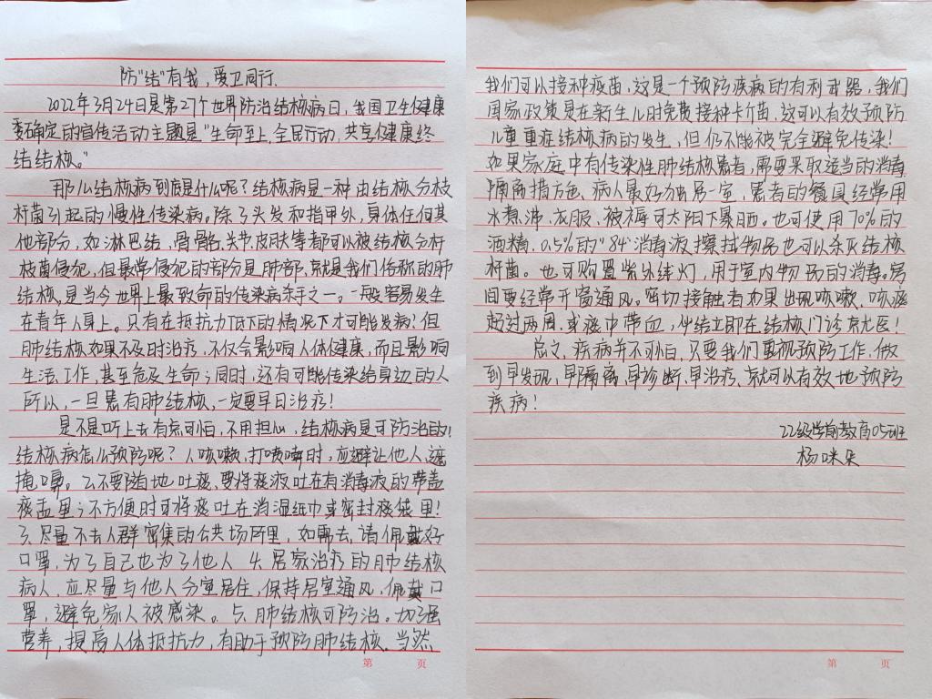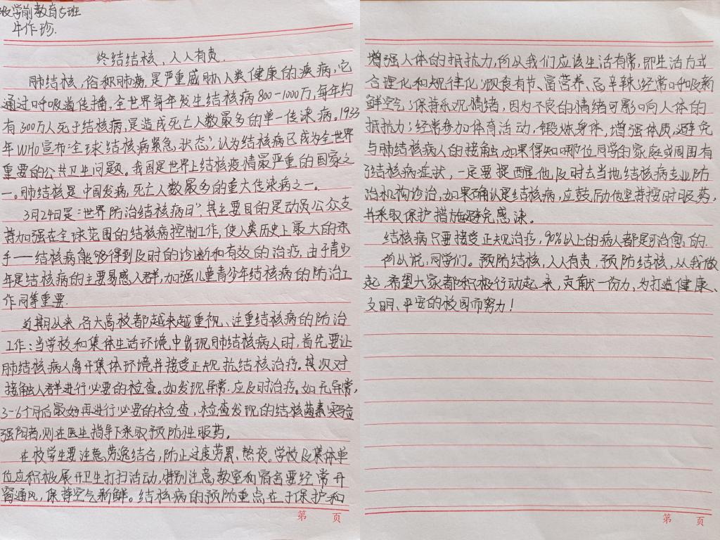 每年的3月24日定为“世界防治结核病日”。为更加快速的向同学们普及结核病知识,唤起同学们预防结核病的意识,增强自我保护意识和能力。3月27日,学前与艺术教育学院开展“你我共同努力,终止结核流行”预防结核病主题征文宣传教育系列活动。