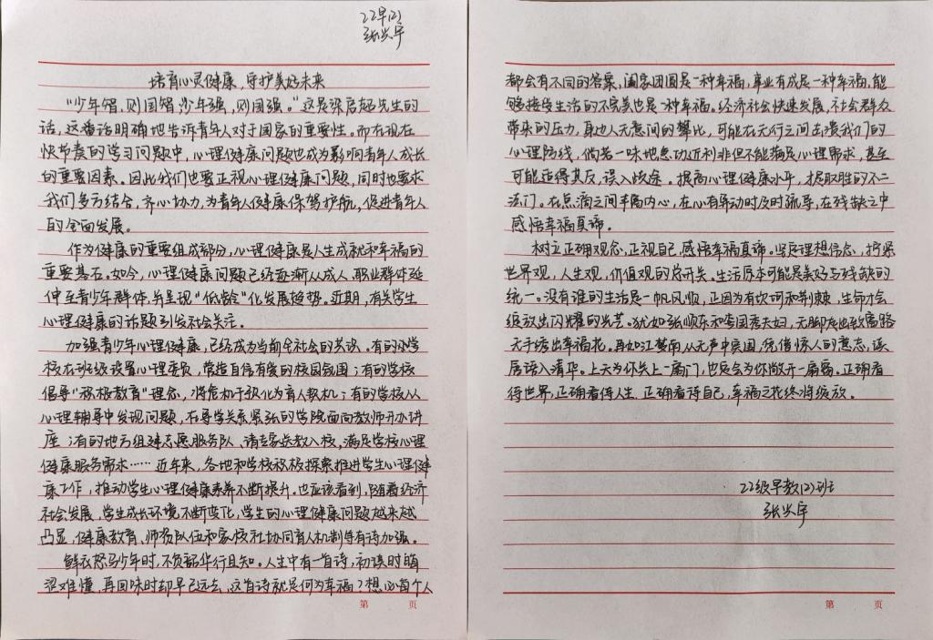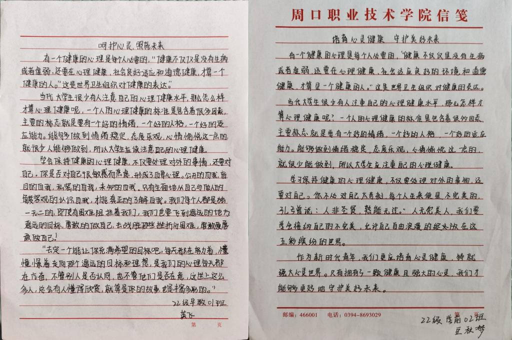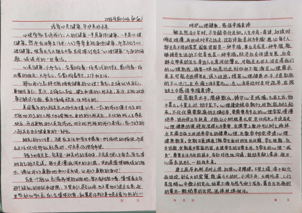 同学们独特的文字表达,展现了青年学子丰富的内心世界以及对心理健康教育的深刻思考和感悟。这些主题征文作品不仅主题鲜明,内容丰富,蕴含深刻意旨,而且宣扬了健康心理对于个人成长的重要意义。下面,让我们一起欣赏部分优秀作品~