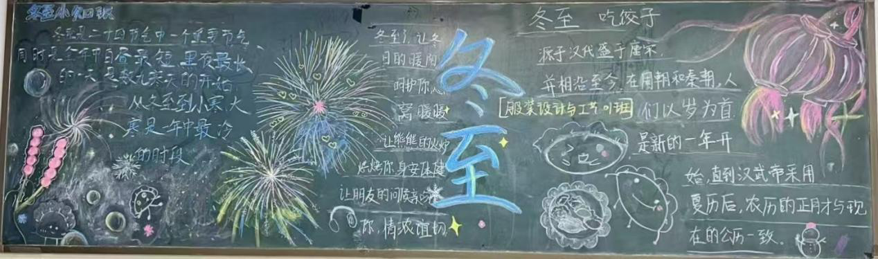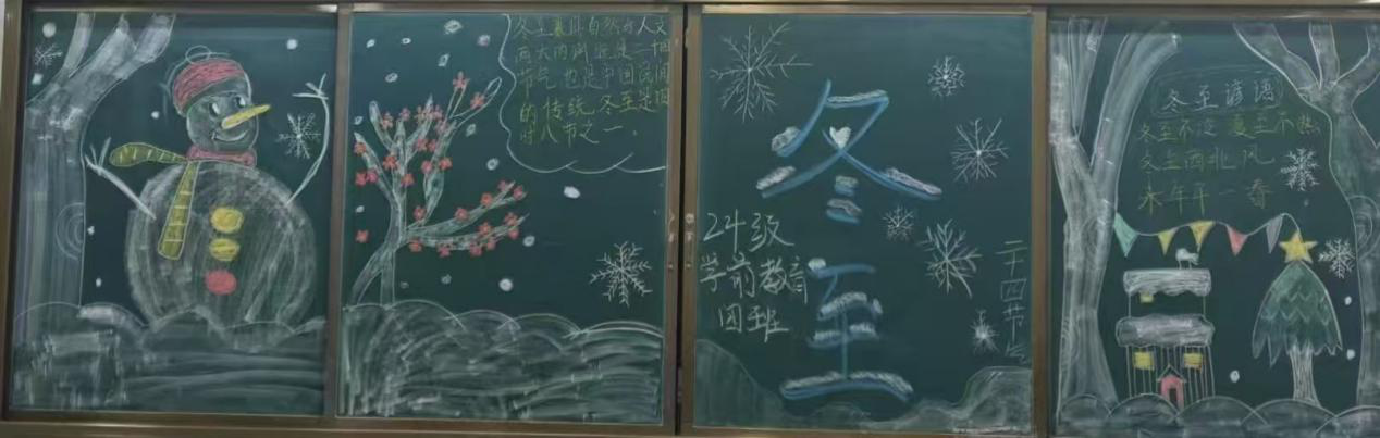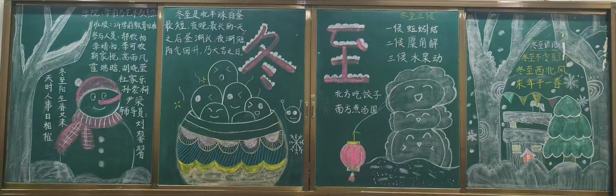 为加强我院文化建设,彰显班级文化魅力,12月20日至22日,学前与艺术教育学院(纺织服装学院)开展冬至系列主题黑板报活动。