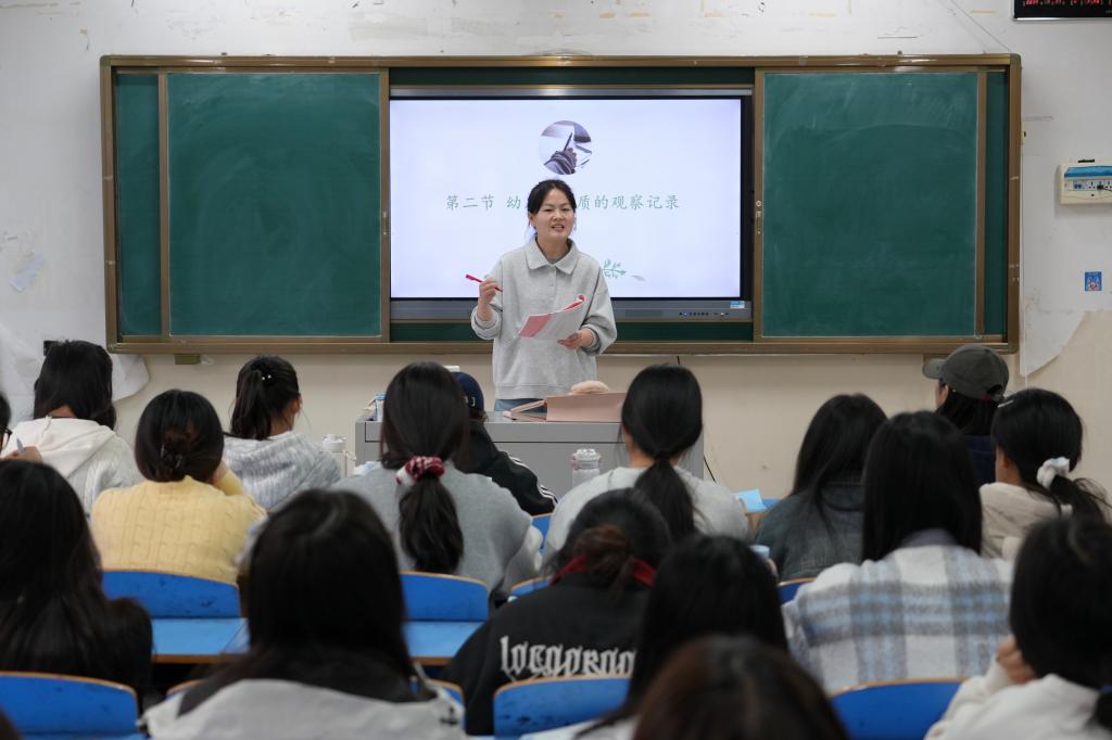 学前教育教研室邵心茹老师主讲《学前儿童行为观察与分析》课程。教学过程中,邵老师精心引入丰富多元的案例,以启发式教学,引导学生主动思考、深入剖析,助力学生对课程重点内容形成透彻理解。课堂上,学生积极发言,师生互动频繁,课堂氛围热烈,有效提升学习效果。