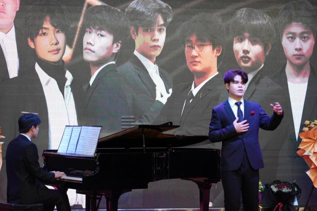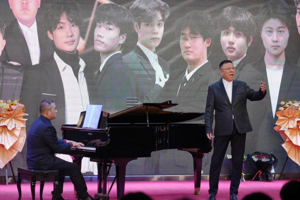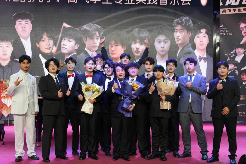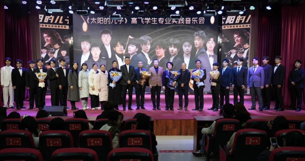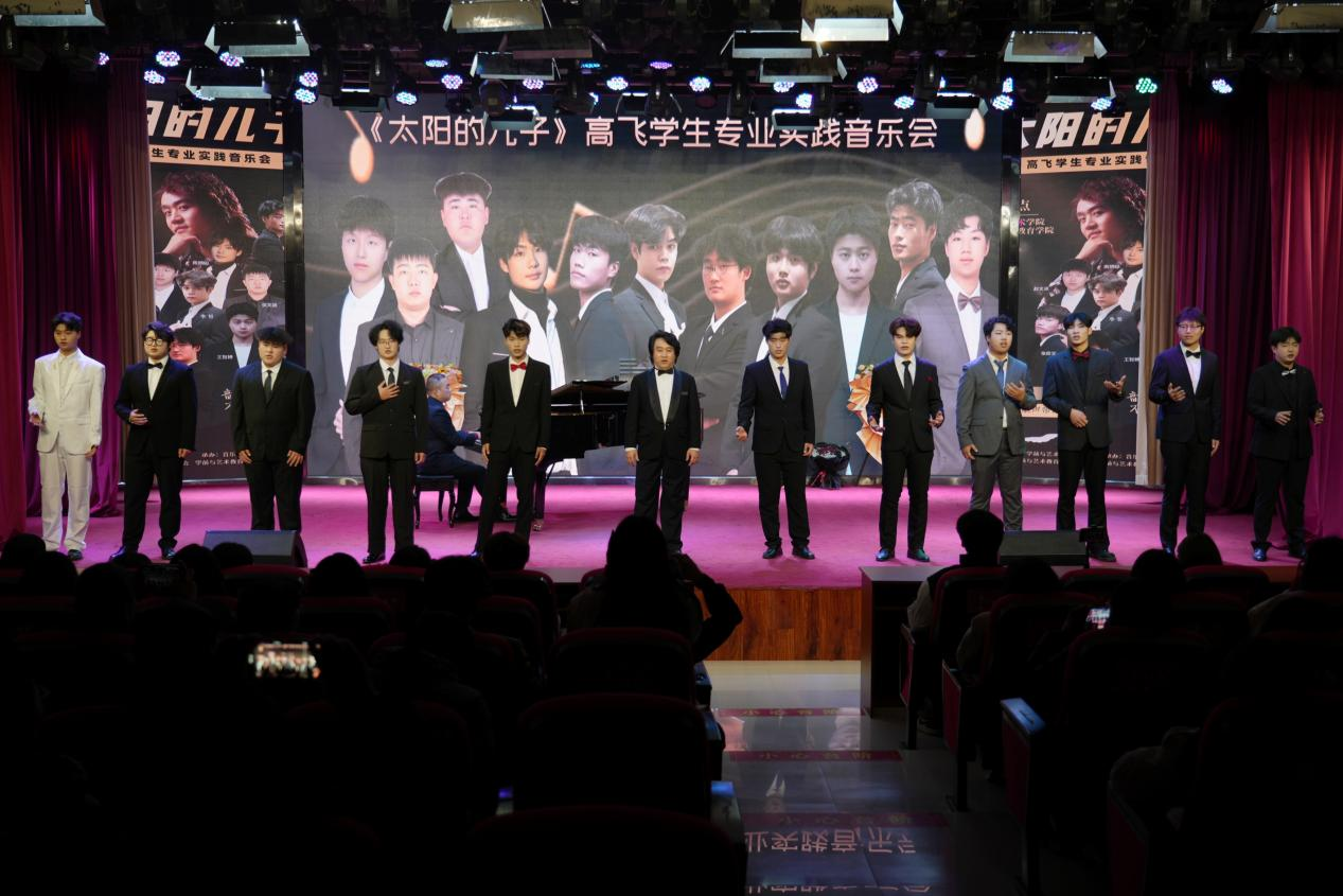 音乐会后段,高飞老师携手学生共同演绎了《月亮代表我的心》和《太阳的儿子》两首经典之作。师生之间的默契配合,宛如琴瑟和鸣,将现场氛围推向了顶点。最后,在观众的掌声中,全场齐唱《我和我的祖国》为这场音乐会画上了完美的句号。